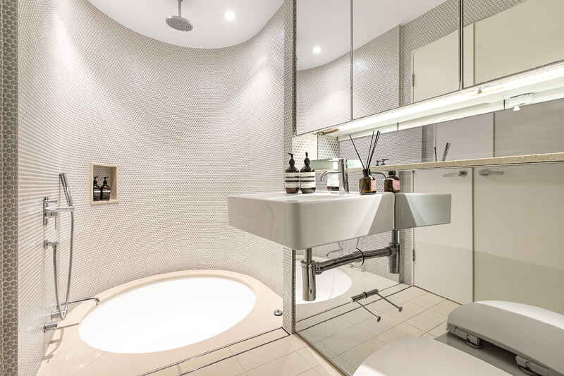 - Gorgeous mosaic tiled main bathroom with sunken tub and rain shower head