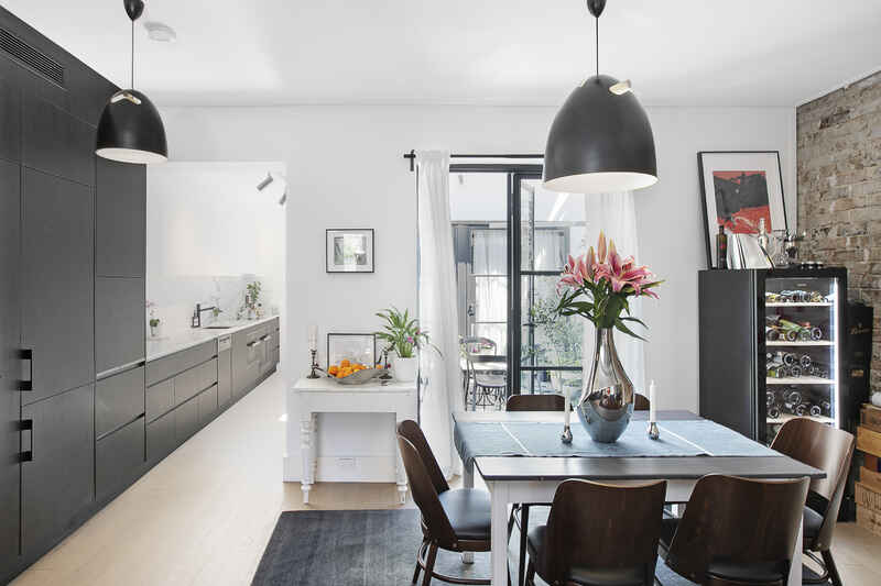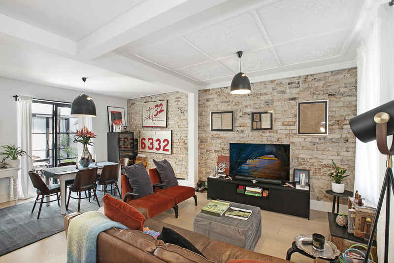 - Open plan living with original ornate ceilings & exposed brick walls, lovely blonde timber flooring & Danish lighting