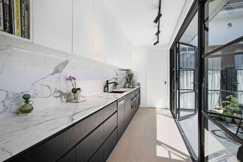 - Stunning marble galley kitchen with gourmet Miele appliances including dishwasher, induction cooktop & steam oven